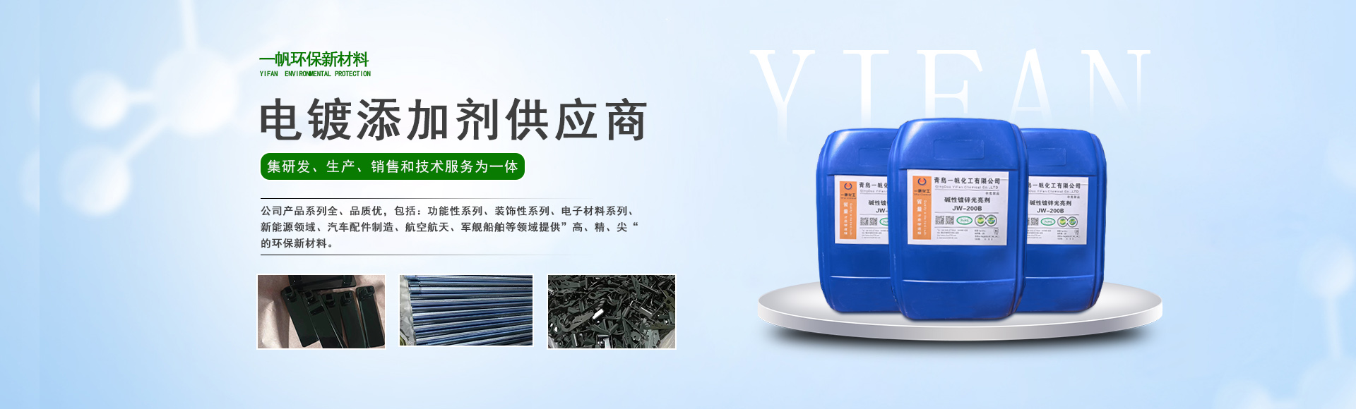 青島一帆環(huán)保新材料有限公司主營(yíng)酸鋅載體、堿鋅中間體等一站式電鍍添加劑服務(wù)商!